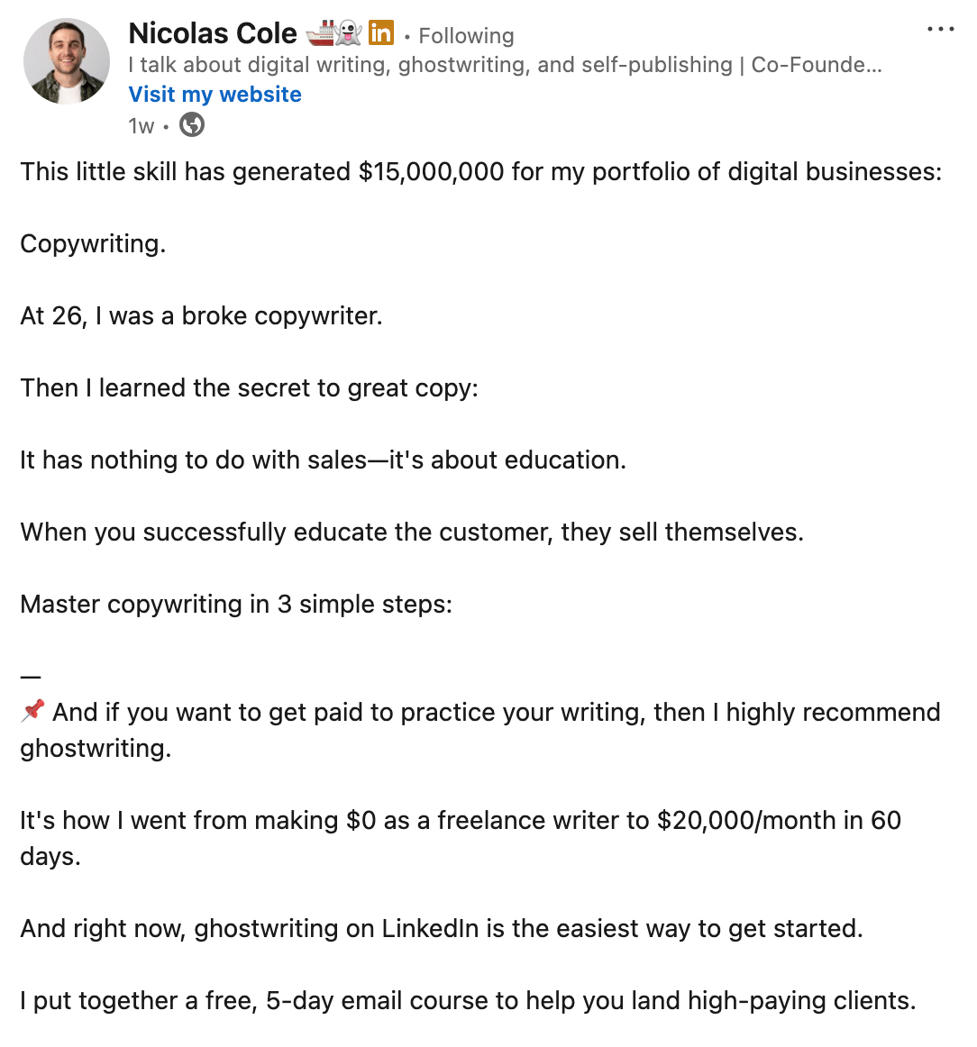 It has been a bit since I read any of Nicolas Cole’s coursework, but I’ve heard good things from a few freelance writers over the past week. Might be worth checking out his 5-day email course (it’s free).