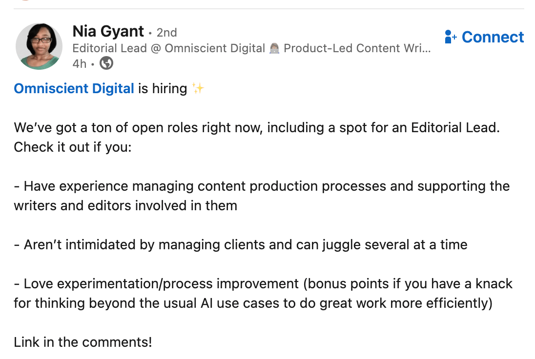 Not my traditional “social post of the day,” but it caught my eye. Anyone who is interested in moving from freelance to FTE, give it a look.